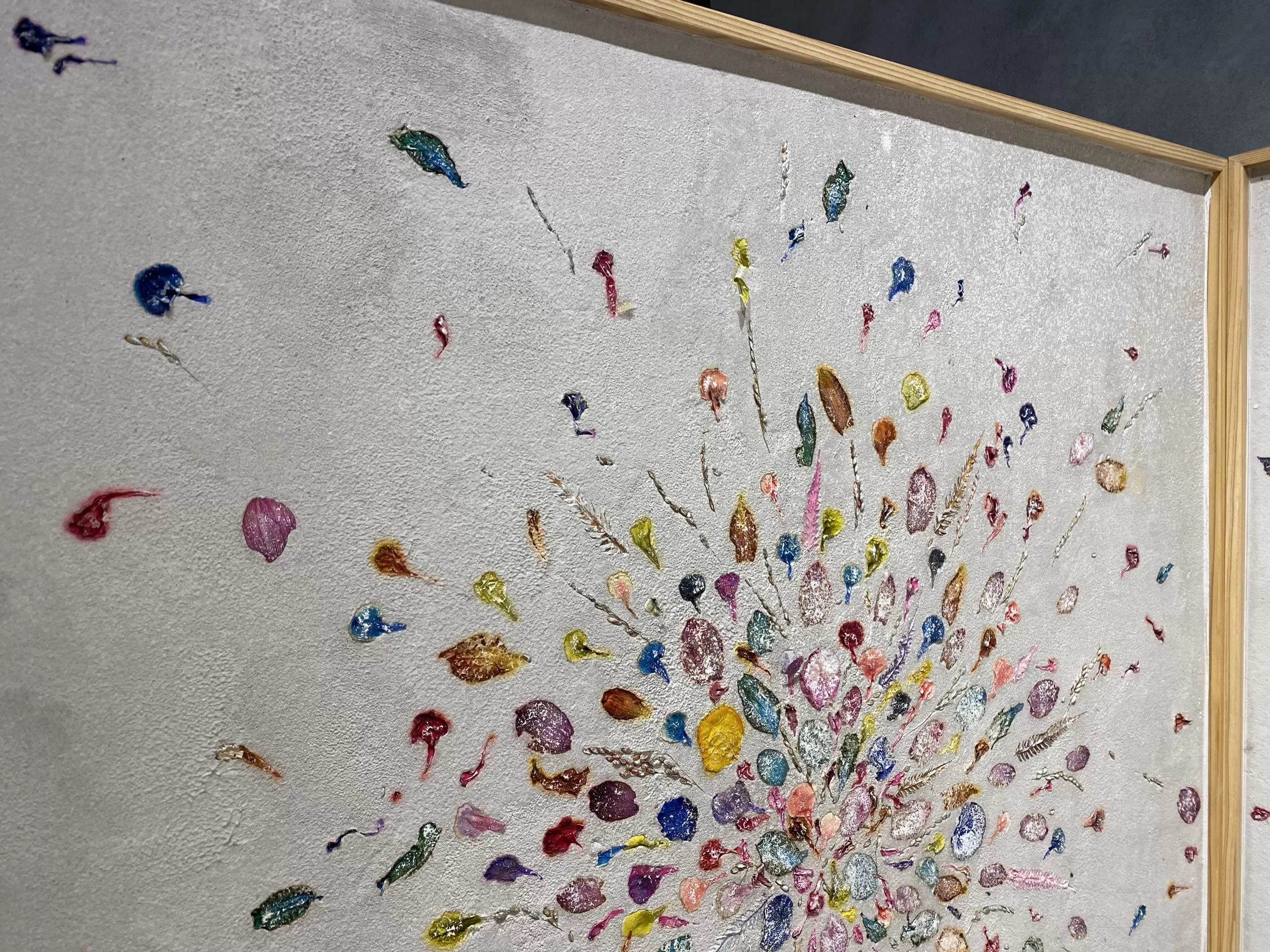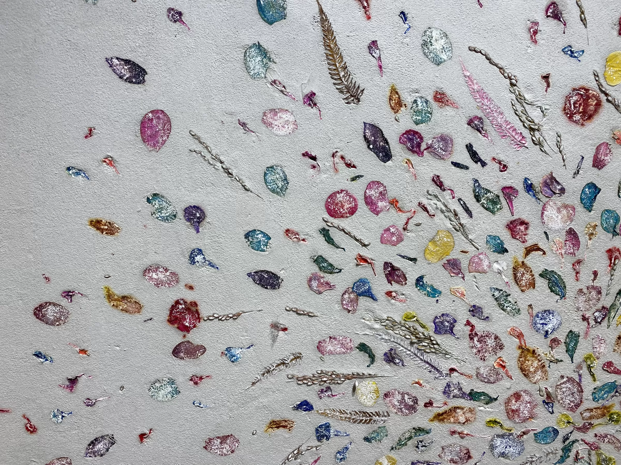 たくさんの色とりどりの花や葉っぱがちりばめられていて