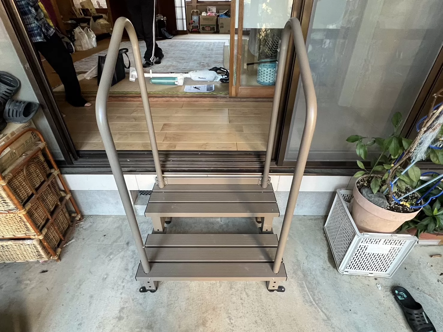 アルミ踏み台というもので、踏み台の両側に手すりがついており、縁側などの高い場所からの出入りがとても楽になります✨️✨️