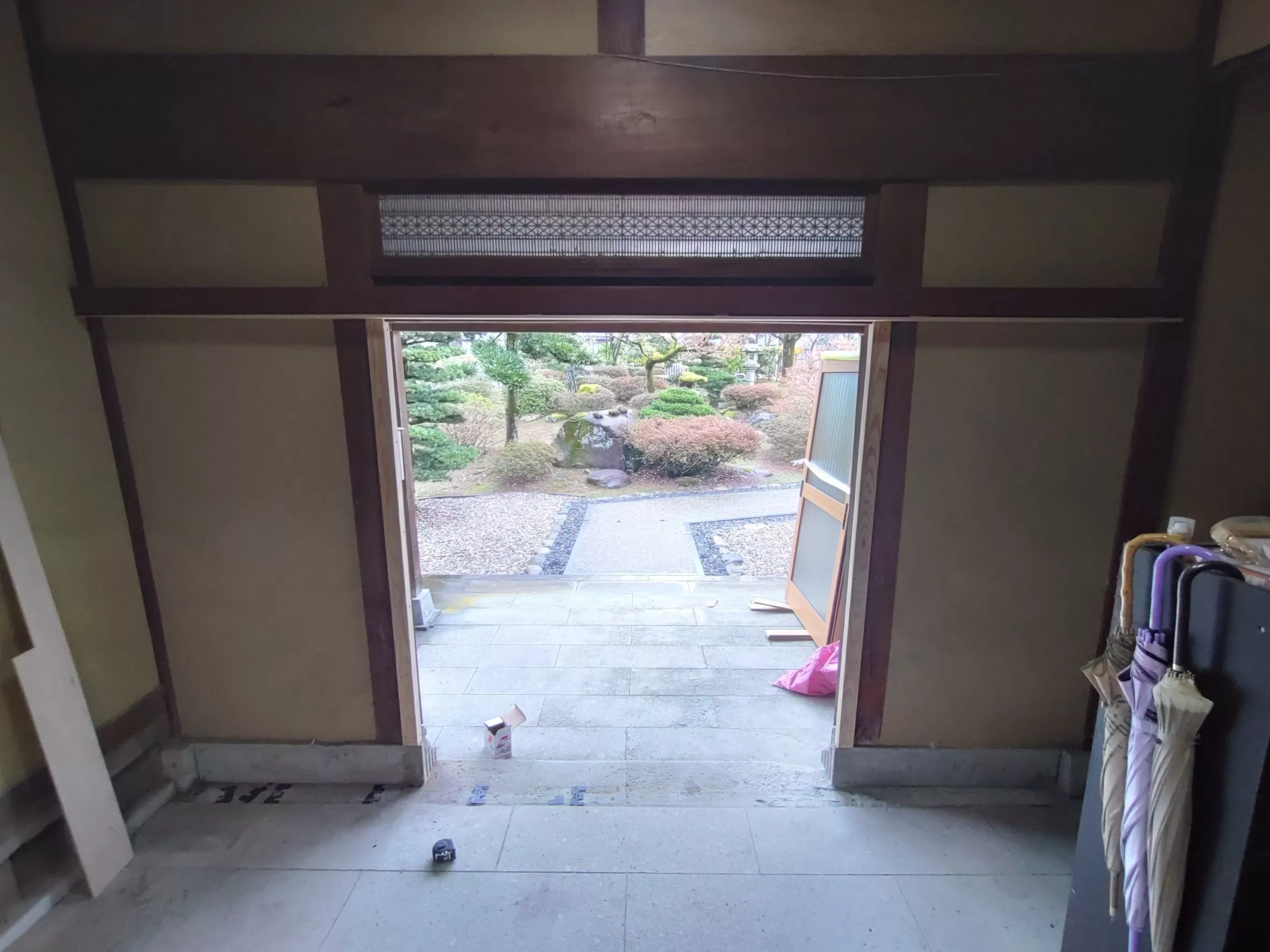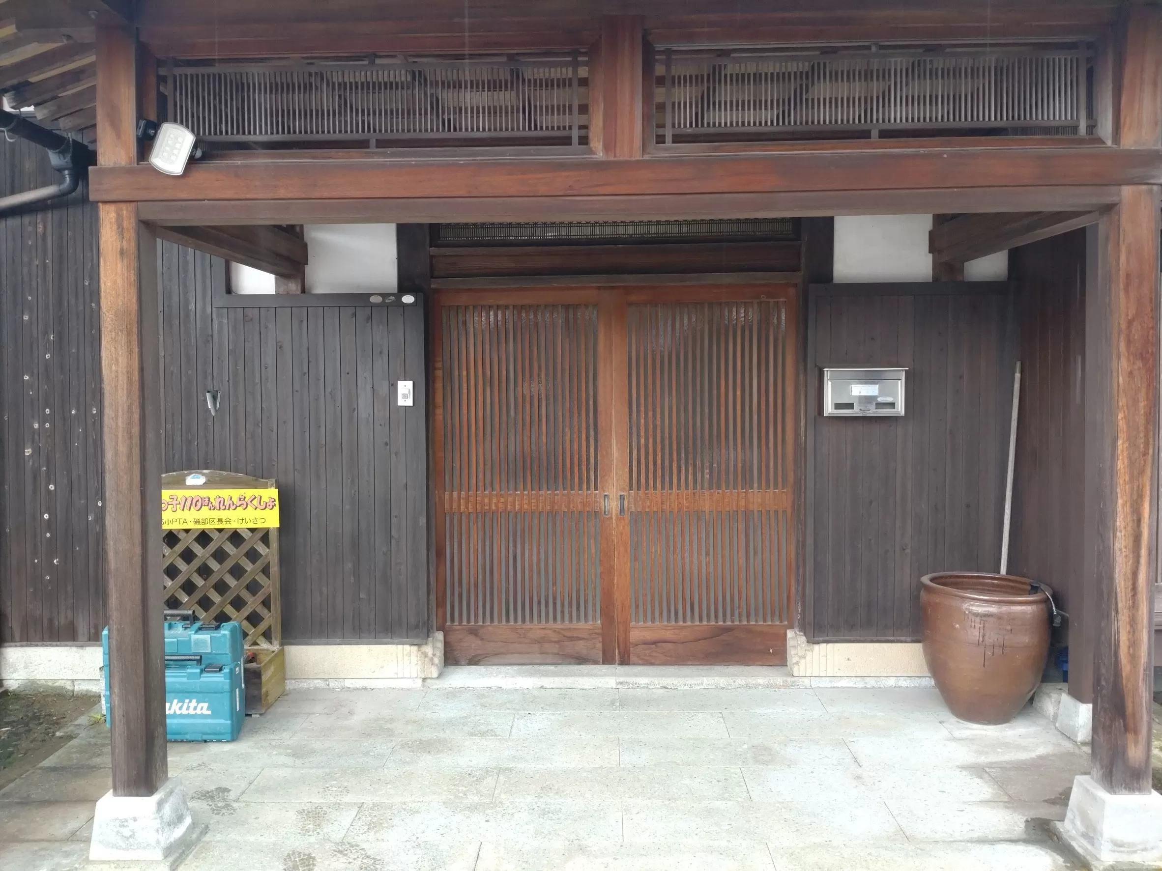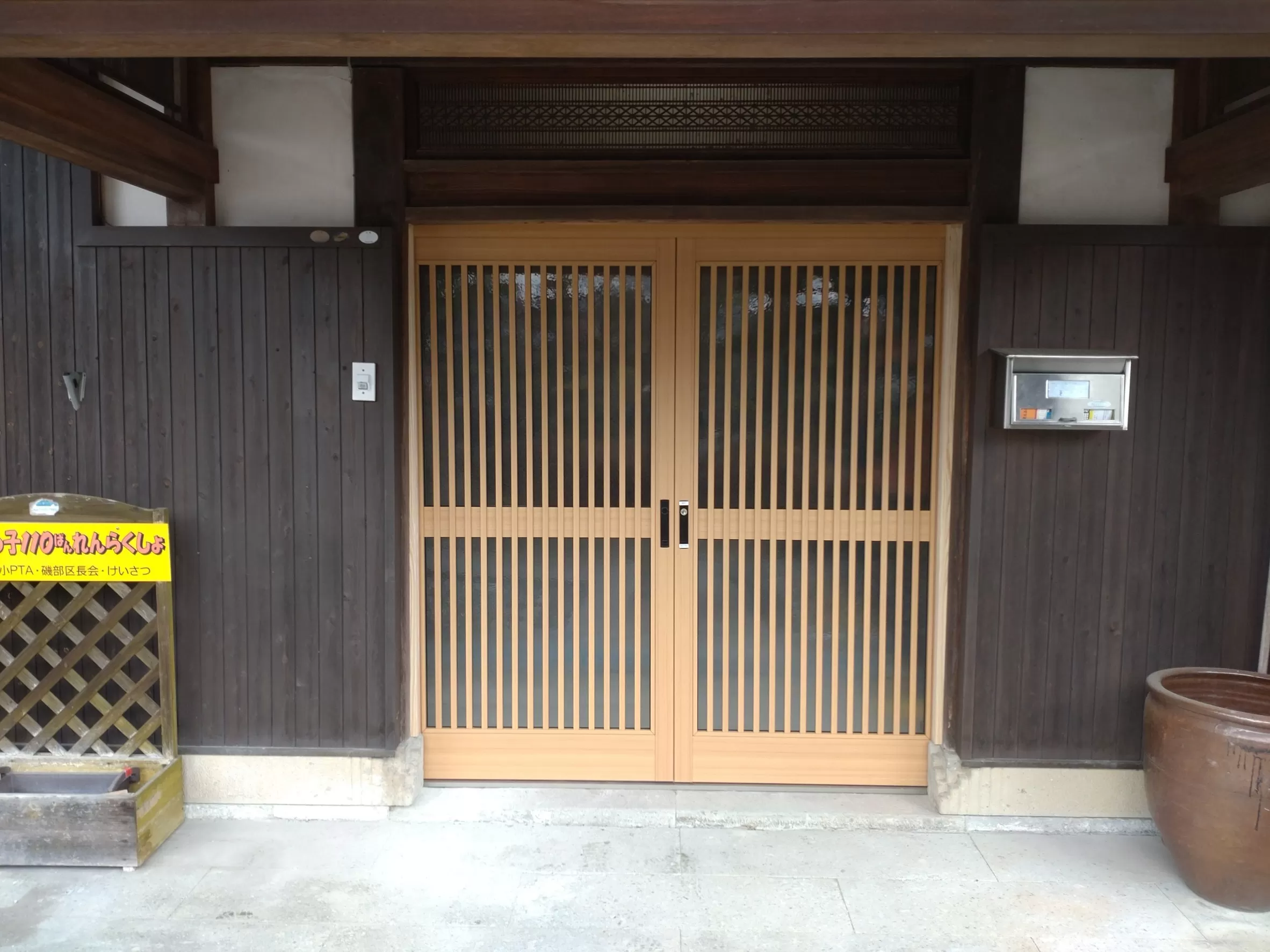 今回の工事ですが、古くなった玄関の木製の引き分け戸をアルミ製の引き分け戸に取替えます。