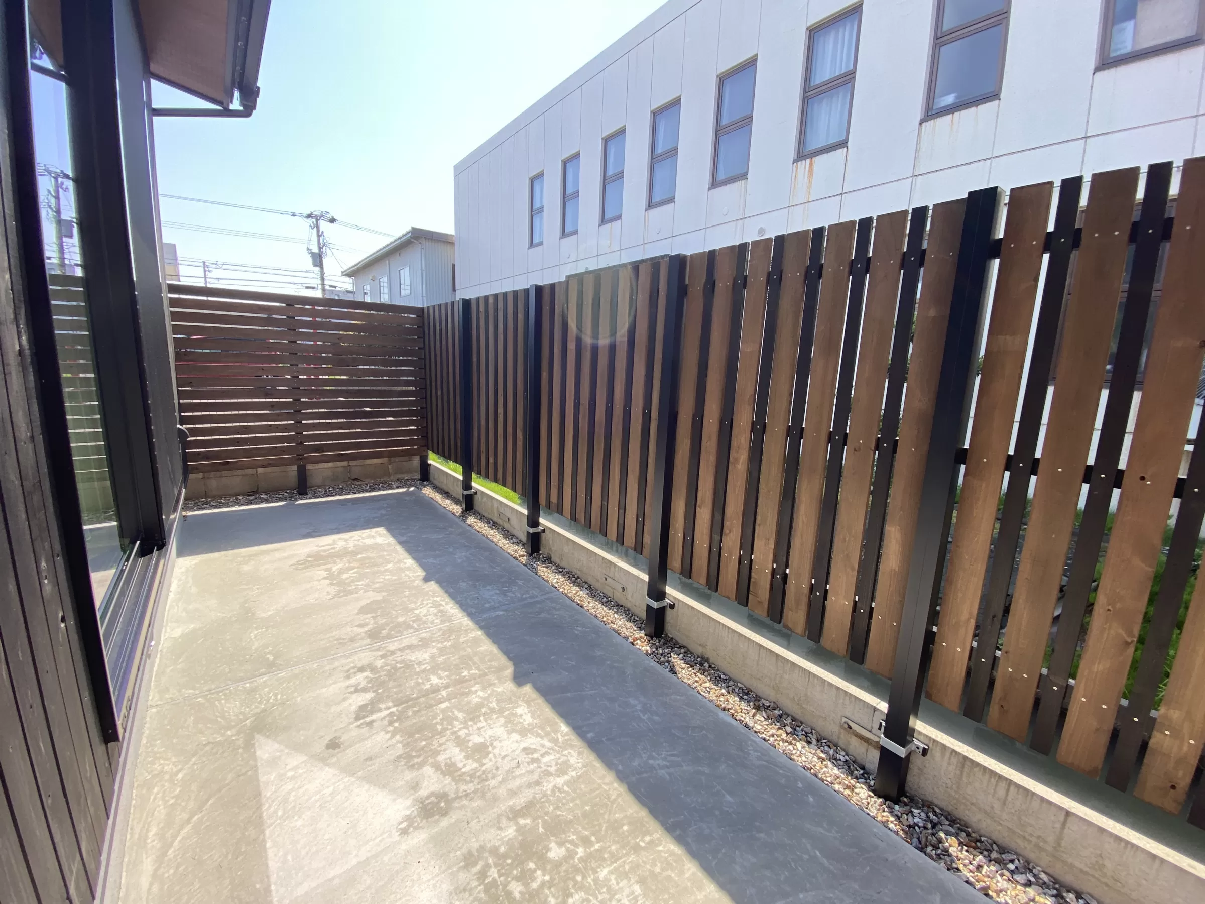太いアルミ製の支柱は、新築工事のときに職人さんが建てたのですが、目隠しの板の部分はお施主様が施工されました。