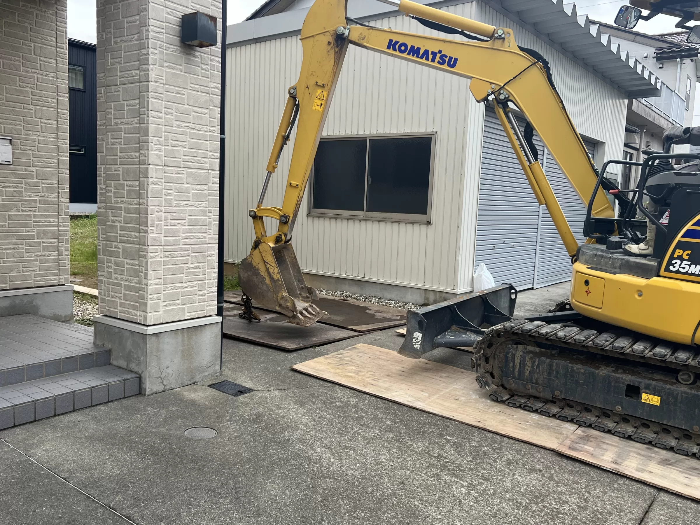 ↑重機が通りますので、コンクリートが割れたり傷がつかないように鉄板養生を敷いていきます。