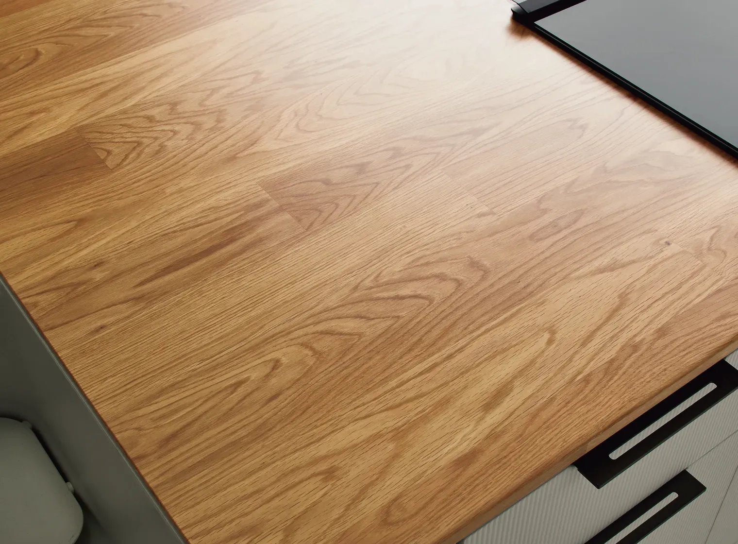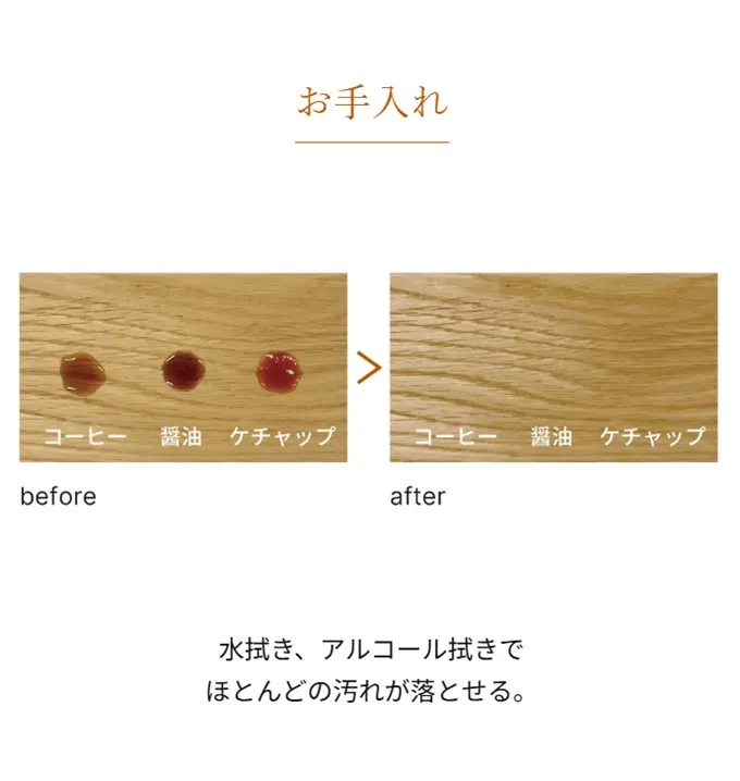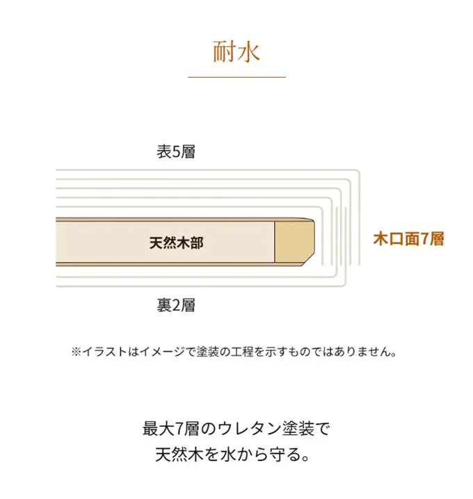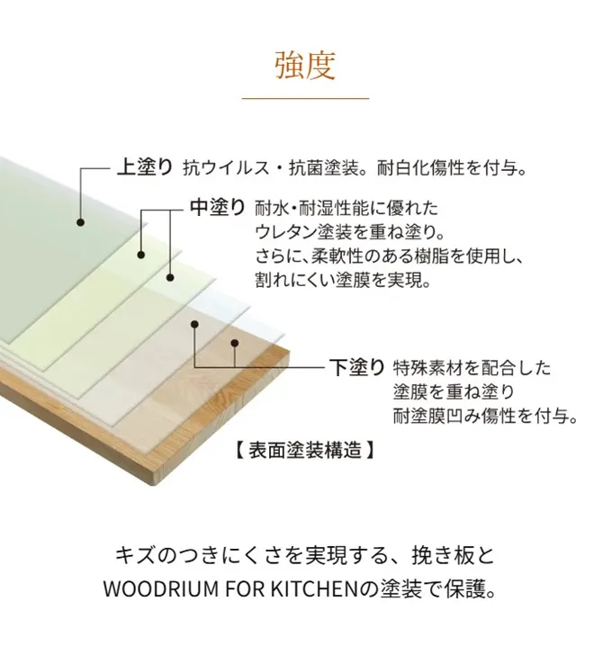 天然木の「挽き板」に新開発の塗装を施すことで、キッチンでの調理作業などに必要な耐傷性・耐水性を向上させています。