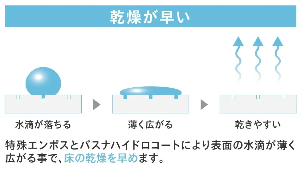 表面の加工で、汚れが落ちやすく乾燥も早いので、キレイな状態を長く保てます。