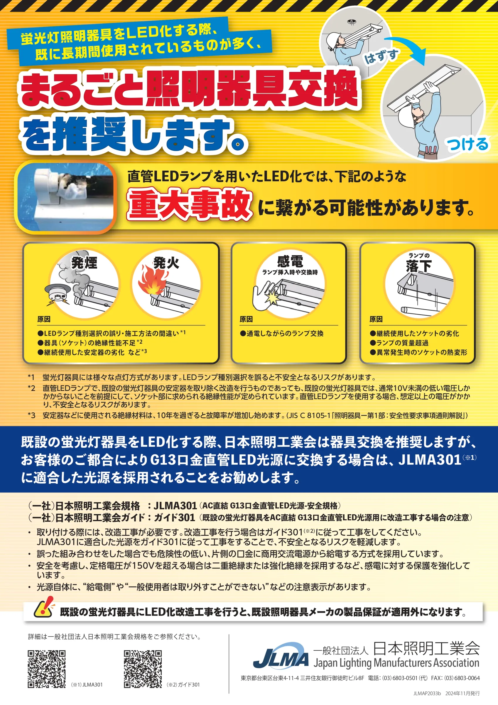 白熱電球や電球形蛍光灯であれば、LED電球に交換できますが、環形蛍光灯やコンパクト形蛍光灯は器具との組み合わせによっては発煙・発火などの事故につながります。