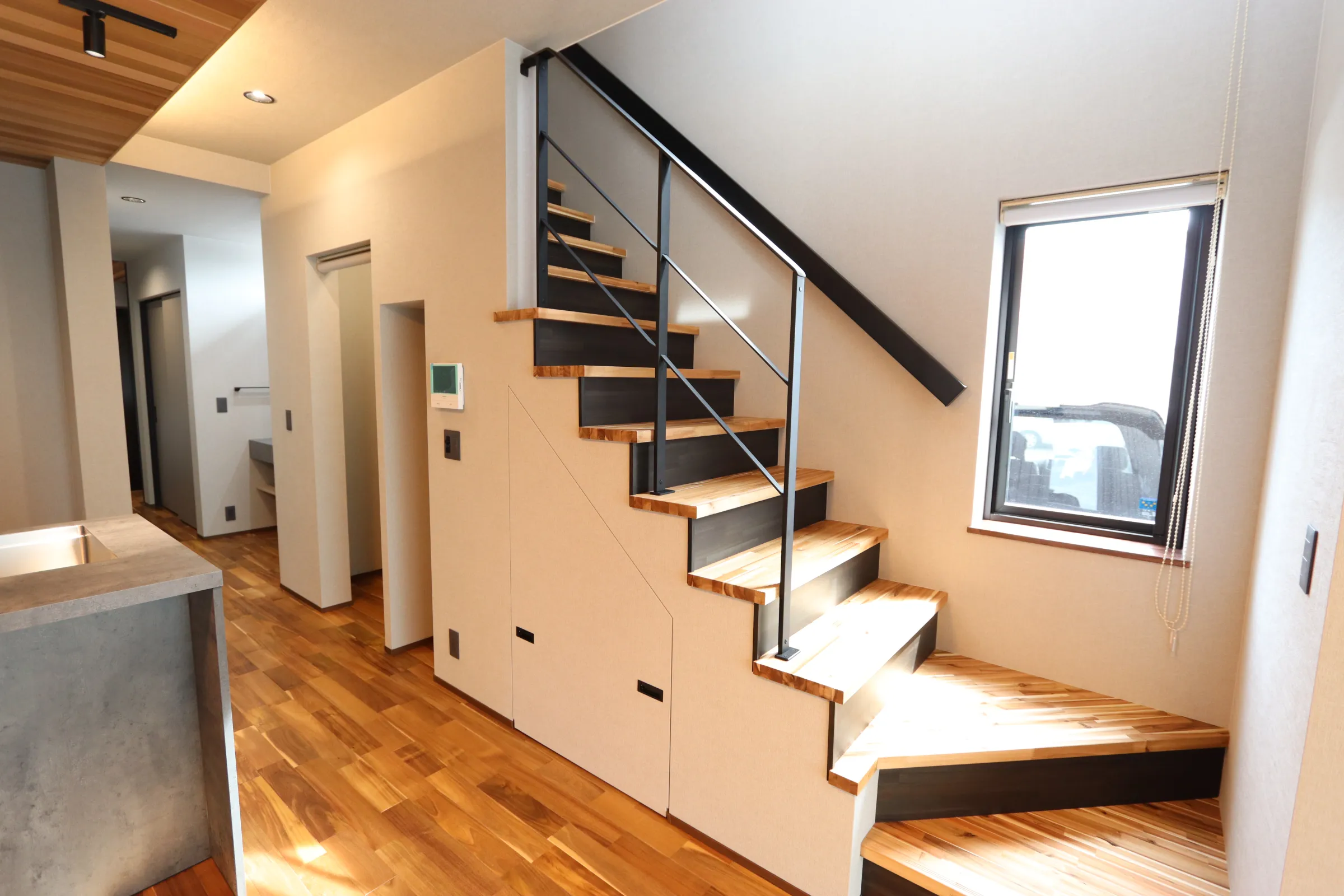 階段下の三角形スペースを、引き出し式の収納にしました。