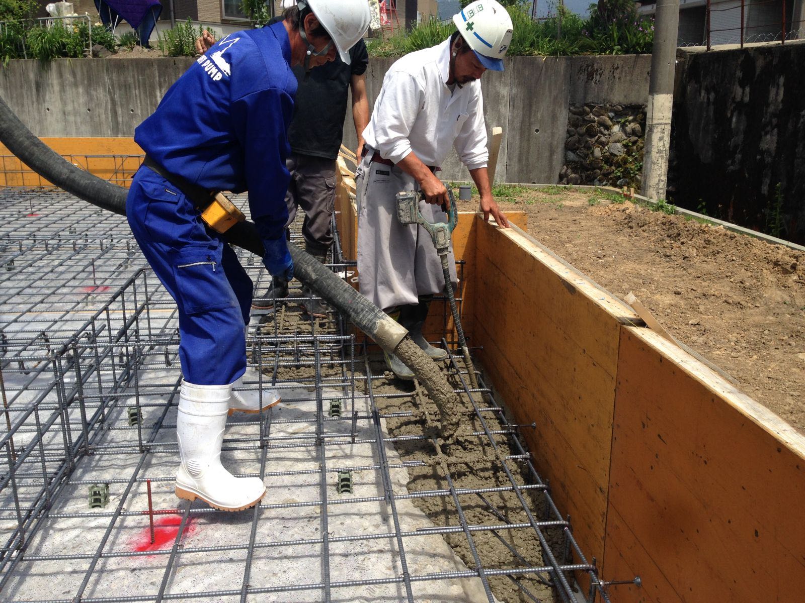 基礎は建物の土台となる重要な部分なので、鉄筋の隅々まで、しっかりとコンクリートがいきわたるようにバイブレーターをかけながらコンクリートを打設します。