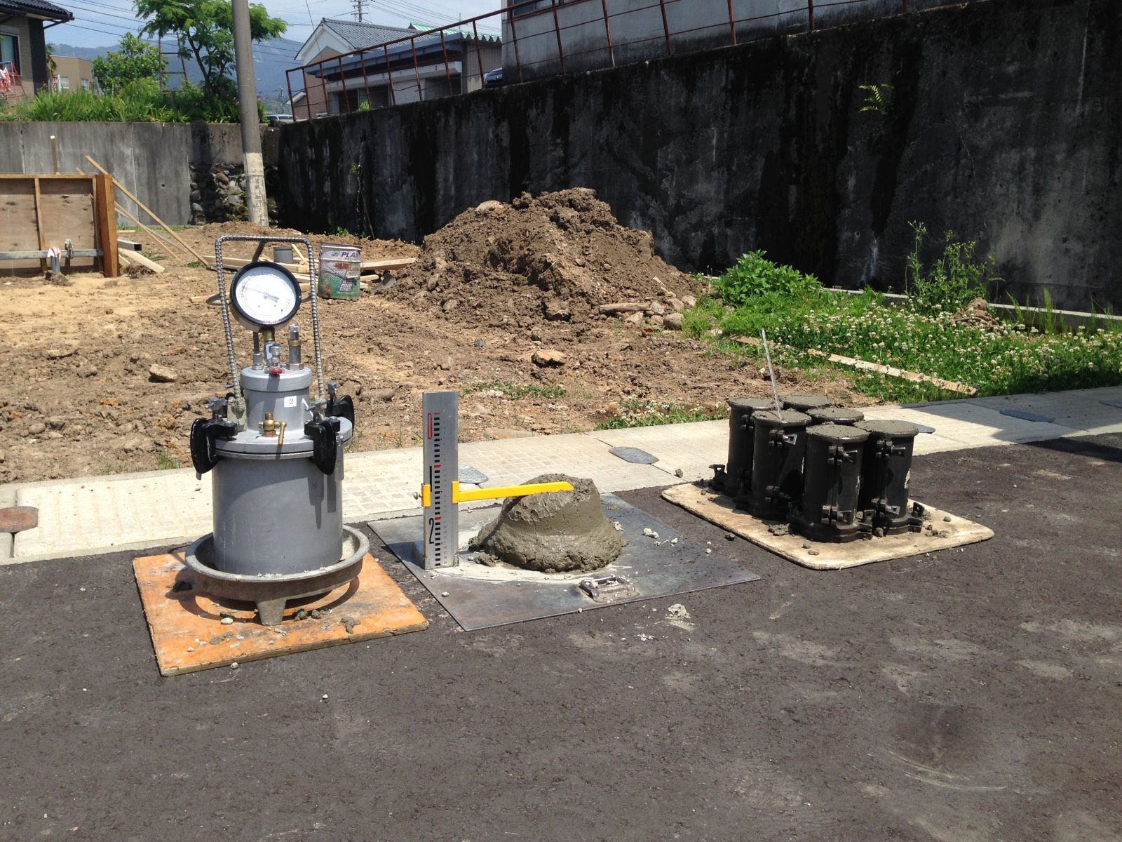 コンクリート受け入れ確認(左 空気量測定 中 スランプ試験 右 破壊試験用テストピース)