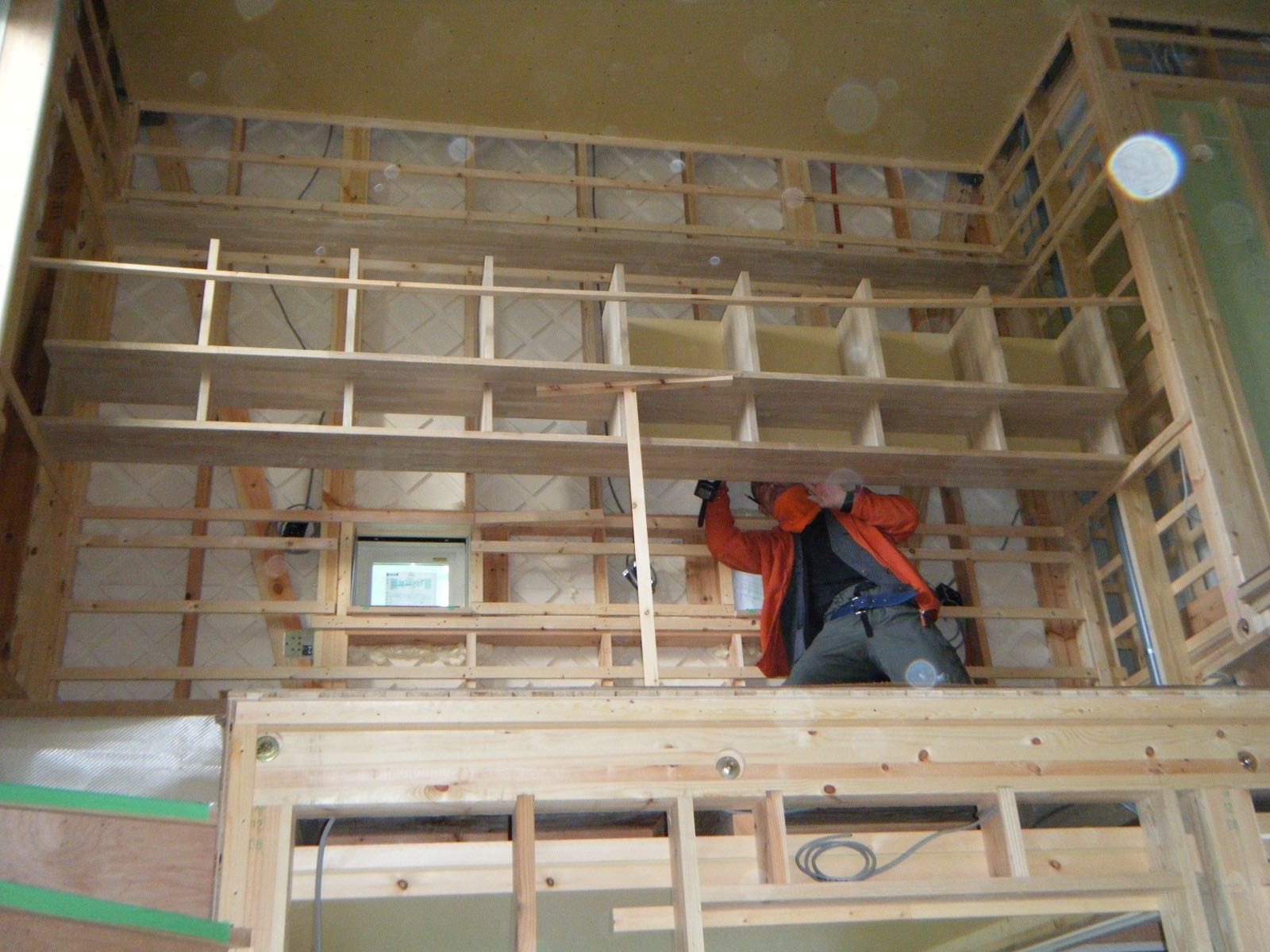 今日は、棚の造作、耐火ボード張り、アンティーク硝子の取り付けを3人で手分けして行いました。