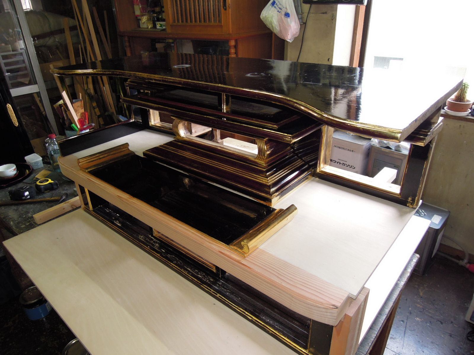 写真は、お仏壇を一度解体した後一部を作り直しているところです。