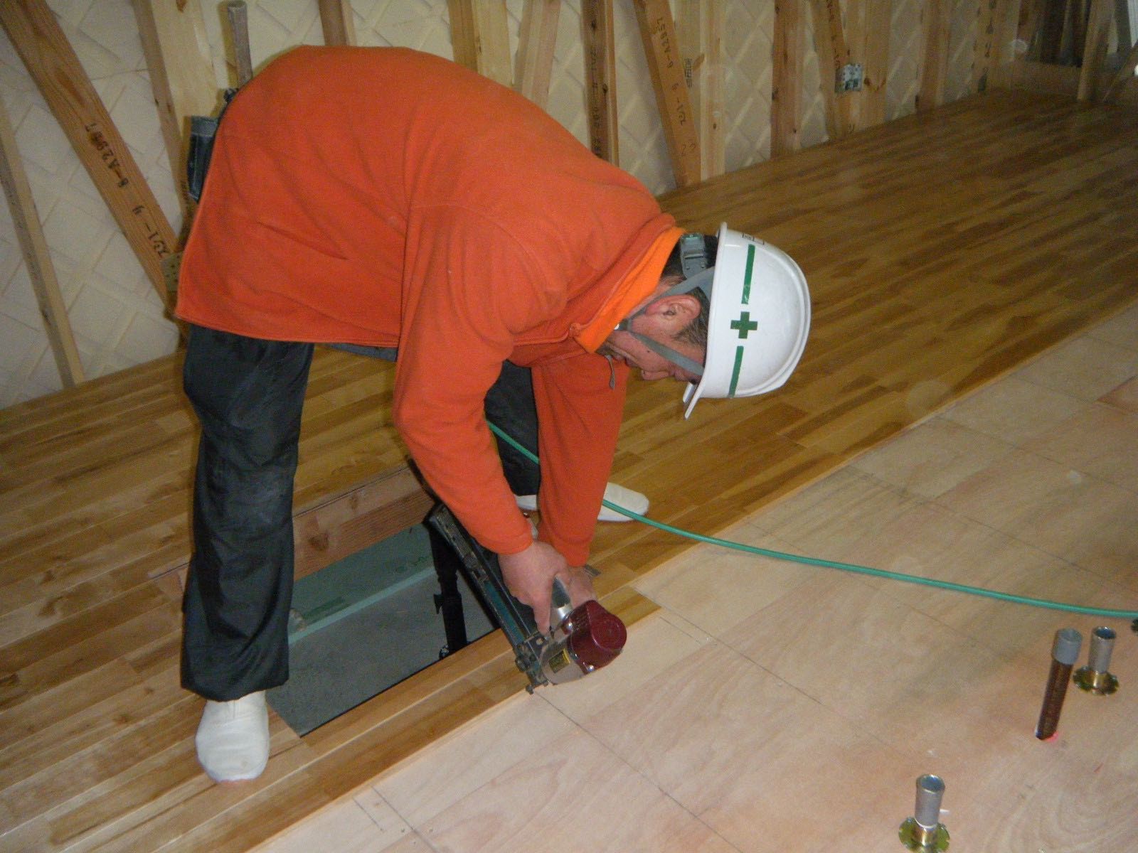 フローリング張り中の棟梁の宮腰さん、1枚1枚丁寧に貼っていきます。
