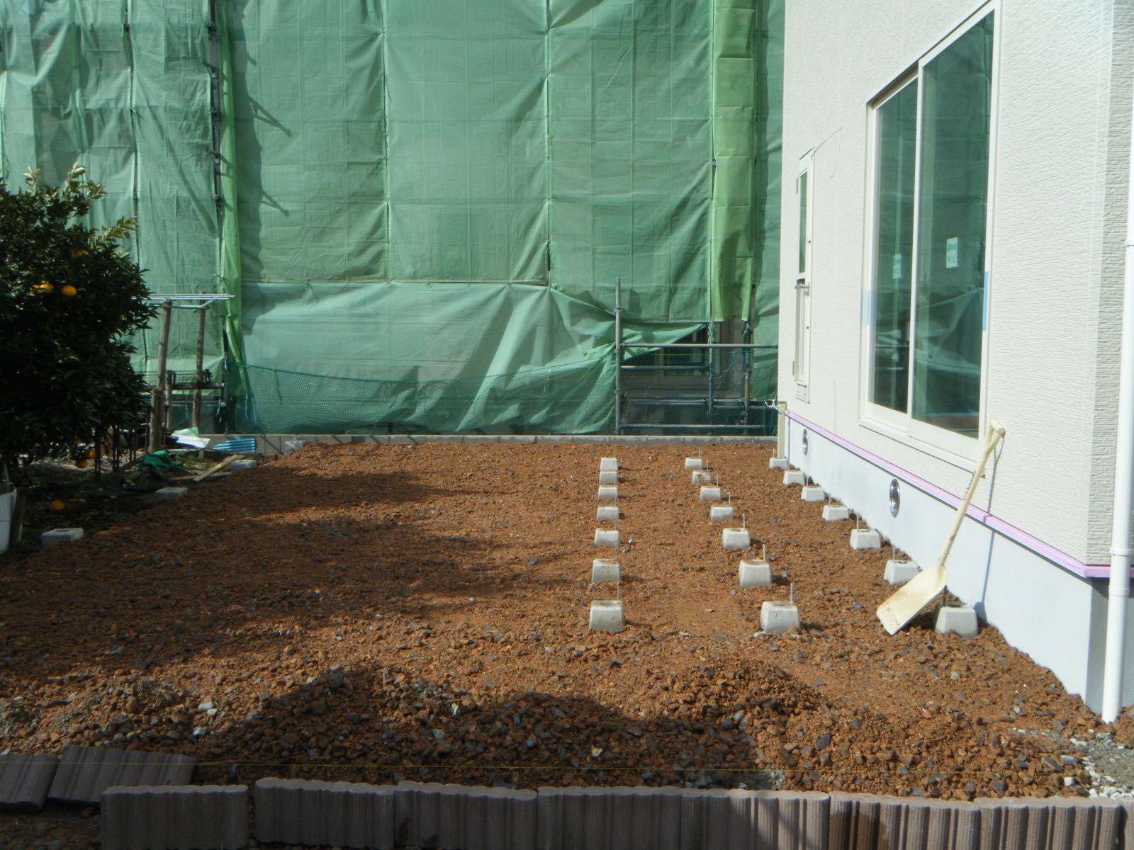 裏側の瓦チップ敷き、駐車場部分のスキトリは終わり、今週中に境界のブロック積みと花壇のレンガ積みを行い、来週土間コンクリートを打設します。