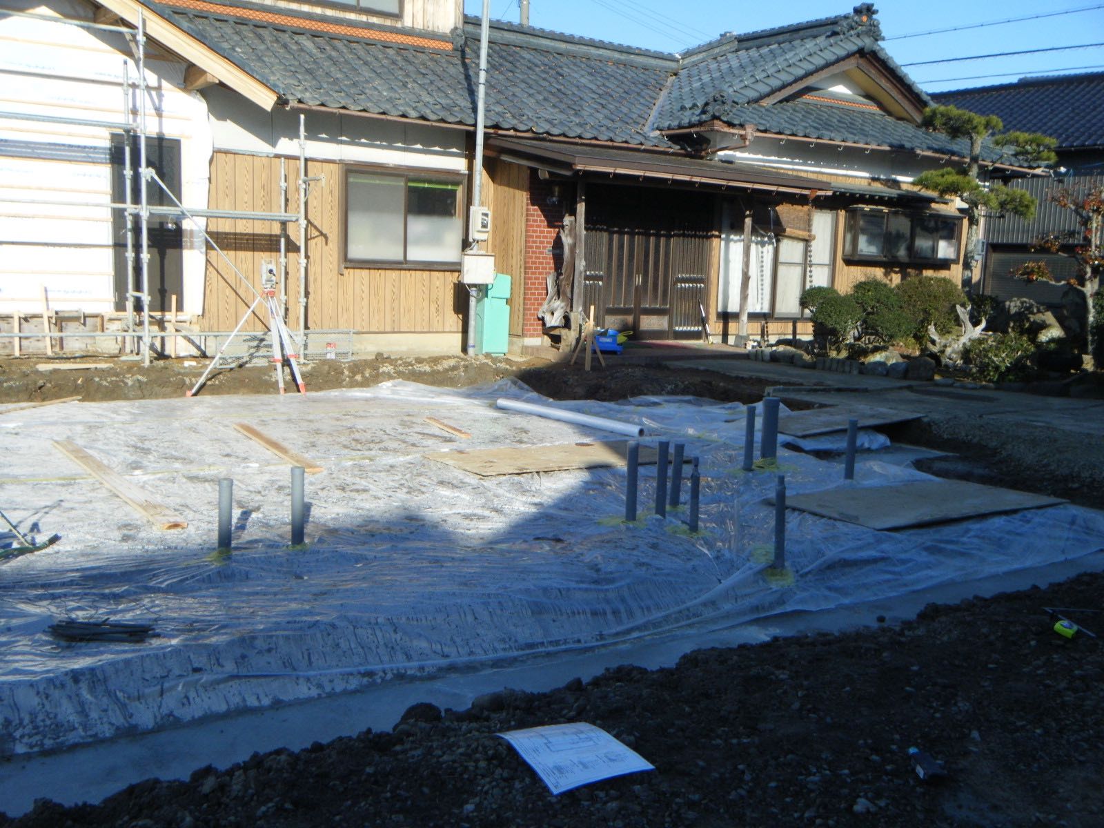 D様邸は、先週、柱状地盤改良が終わり先行の埋設配管工事と基礎の捨てコンクリートの打設まで進んでおります。