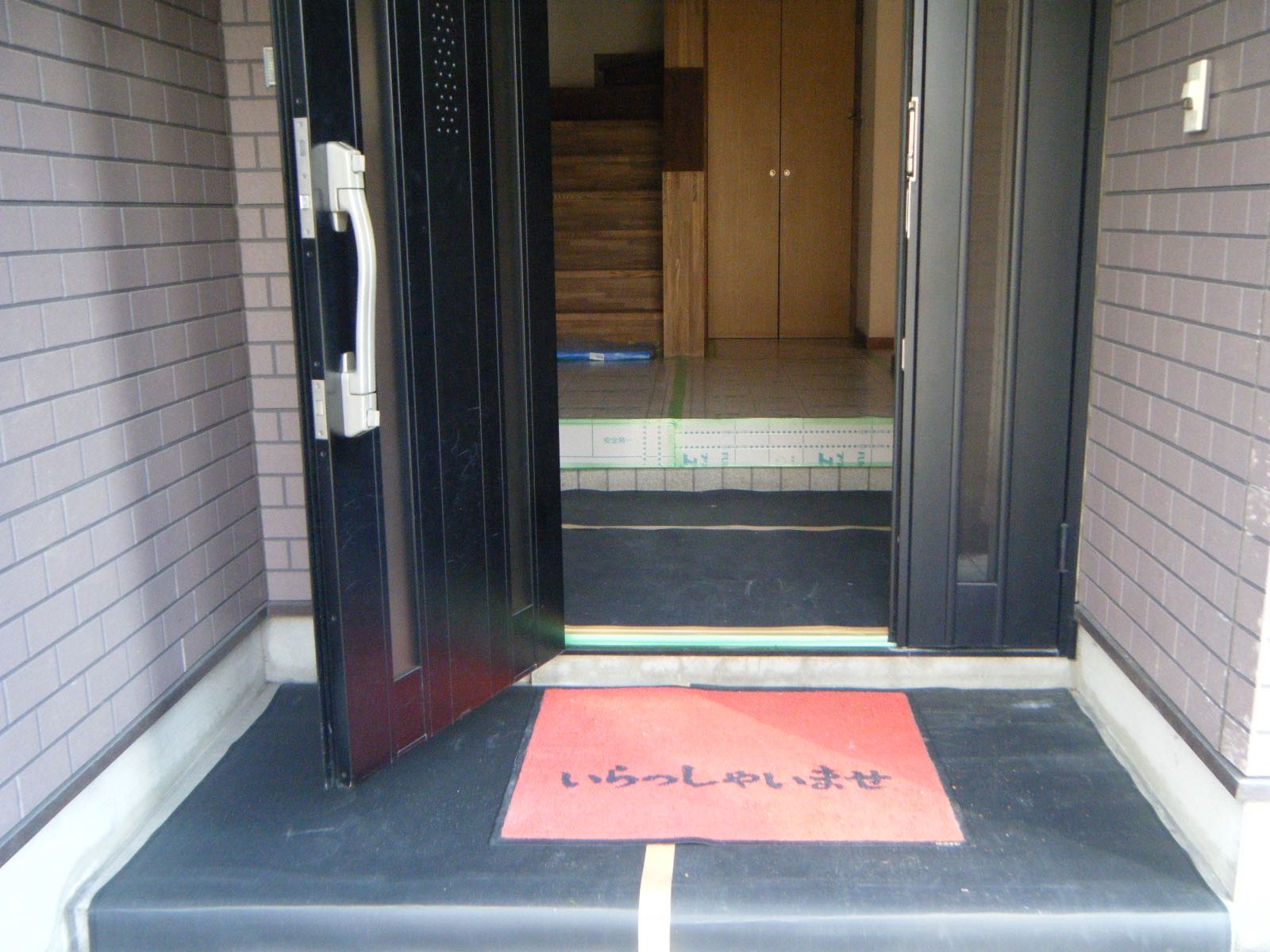 作業通路養生状況(ポーチのタイルもしっかりと養生しています。