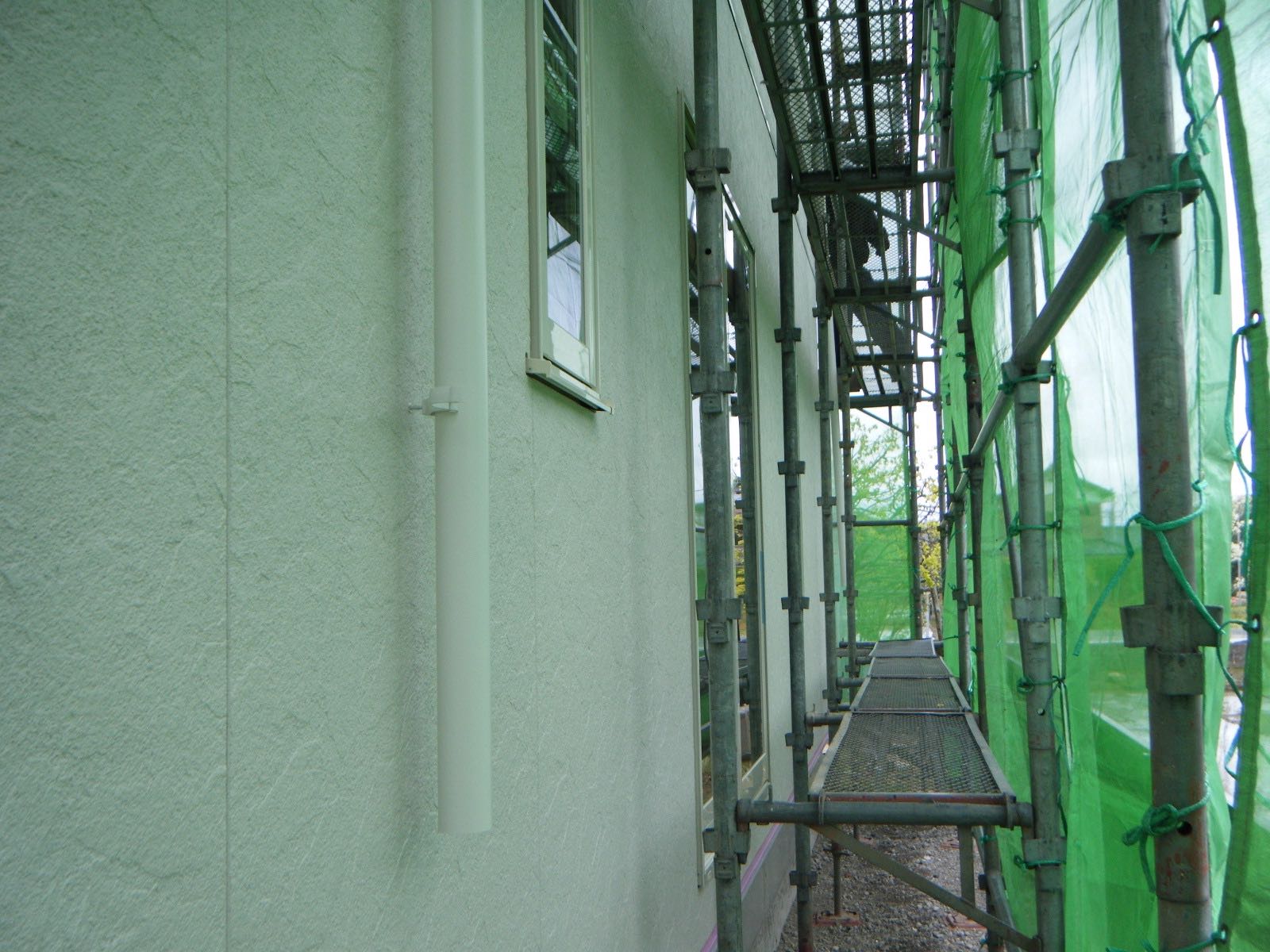 Y様邸は現在の工事状況ですが、外部工事は、今日外壁サイディング張りと樋の取り付けが終わり、連休明けにシーリング工事、庇の取り付けをして5月中頃には足場を解体する予定です。