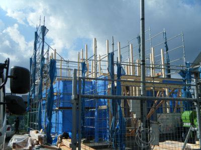 10時の休憩の時には、2階の柱建てまで進み、お昼には本屋の小屋組まで進みました。