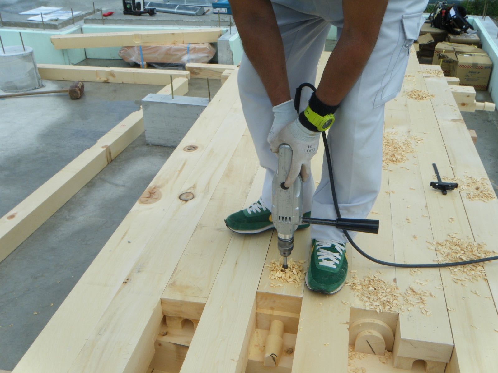 土台にアンカーボルト用の穴をあけている、棟梁の和泉さん