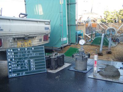 生コンクリート受け入れ検査状況(右がスランプ試験、中央が空気量測定、左がテストピース)