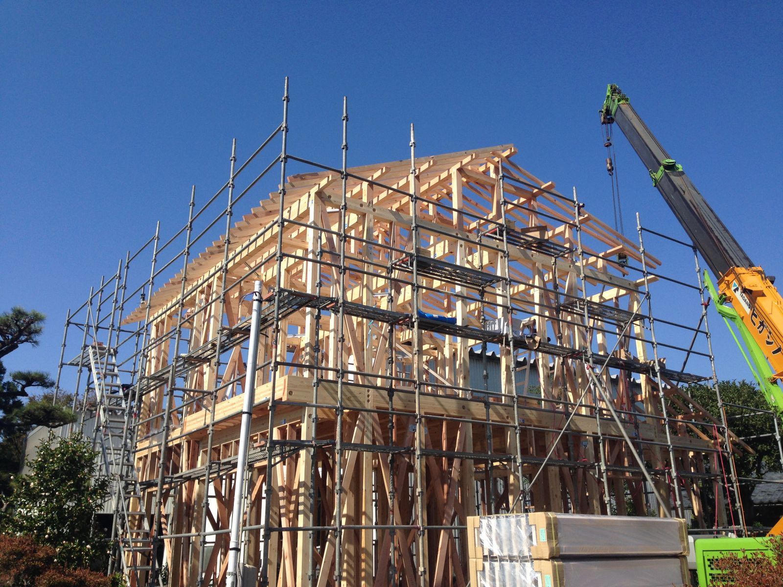 棟梁の和泉さん、応援の大工さん、鳶さん、レッカーさん、早朝よりの作業、大変お疲れ様でした。