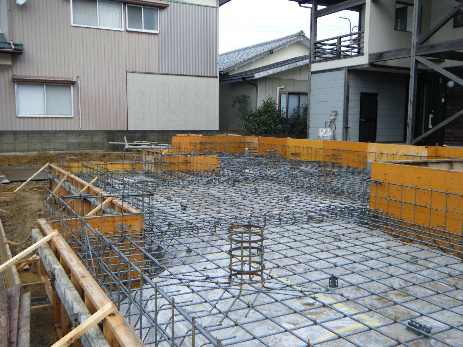 この現場は、敷地内で50cm以上の工程差があり、通常のべた基礎だけでなく、一部深基礎にしたり部分的に布基礎があるのでいつもより複雑な配筋でした。