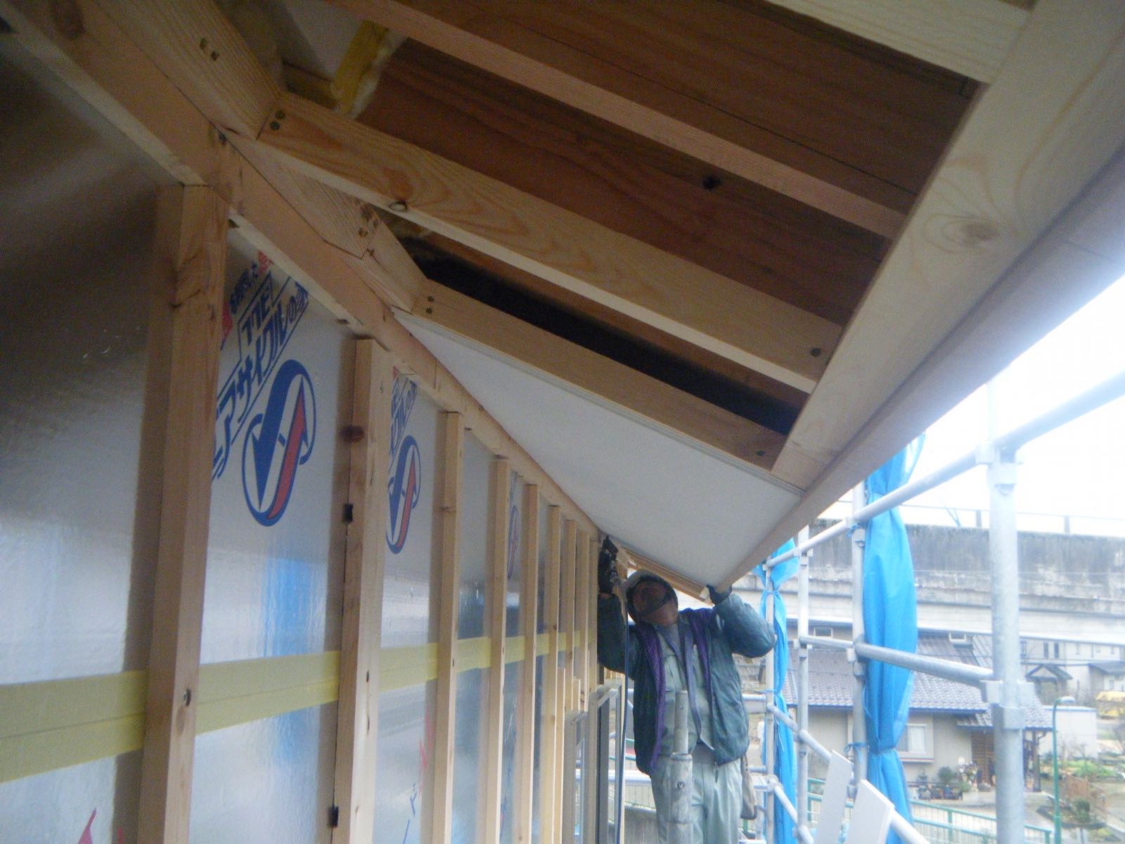 現場では、大工さんが軒天のケイカル板貼りの作業中でした。