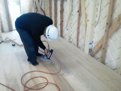 モデルハウスの内部造作ですが、1.2階の天井ボード貼りが終わり、昨日より床張りの作業に入りました。