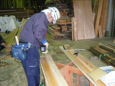 今日は、大工さんが材木屋さんの倉庫で、屋根の破風板等の加工作業を行いました。