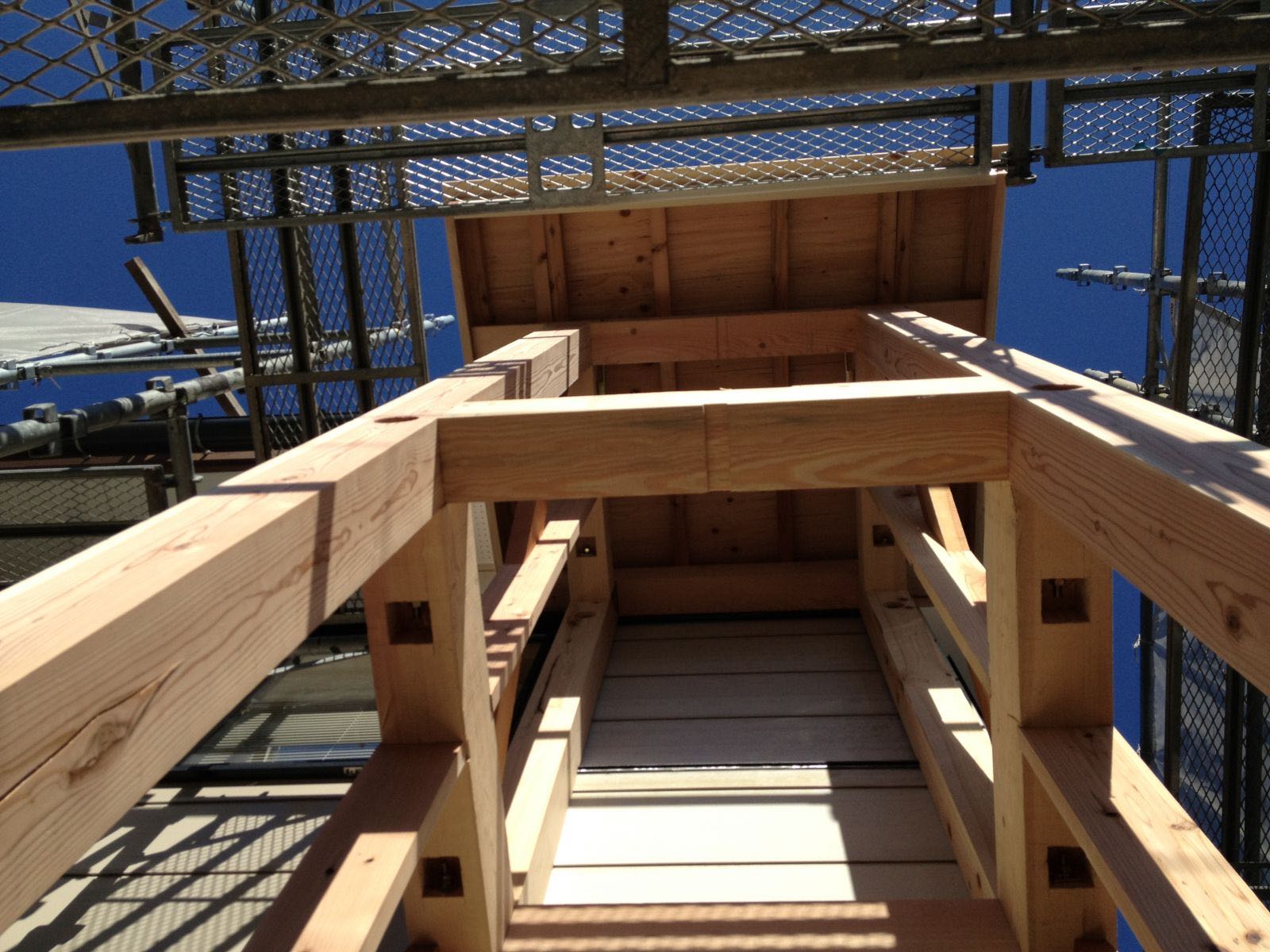 大工さんの宮腰さんと協力し、柱を建て、桁をかけ、屋根までしっかりと建ててきました