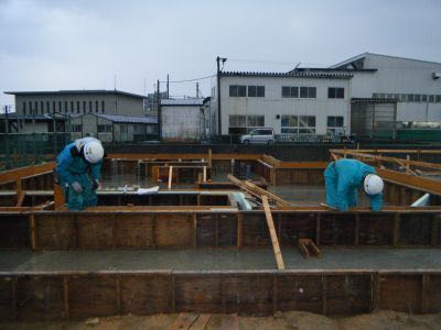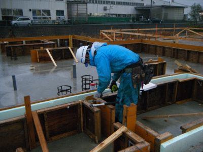 昨日より、墨出し・型枠建込の作業を初め、今日も引き続き型枠建込み行い、アンカーボルトのセットまで完了しました。